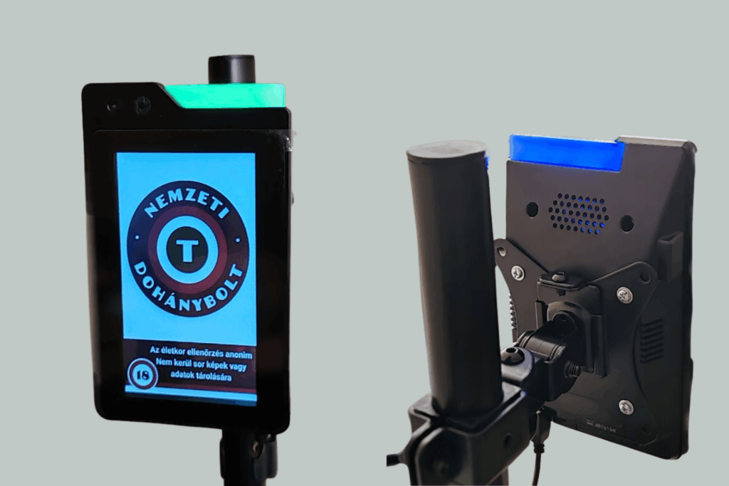 Pénztárhoz kihelyezhető életkor ellenőrző eszköz. AI-alapú életkor meghatározás arcfelismeréssel. A készülék kijelzővel rendelkezik, amelyen utasítás jeleníthető meg a vásárlónak.
