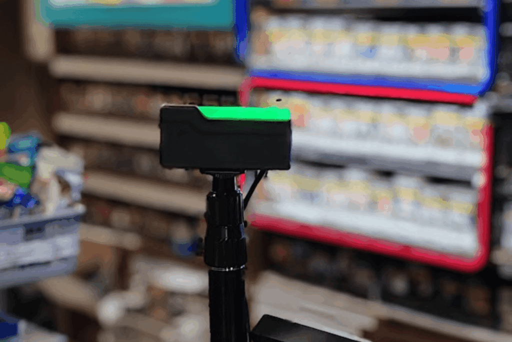 A vásárló a kasszánál az eszköz elé áll.