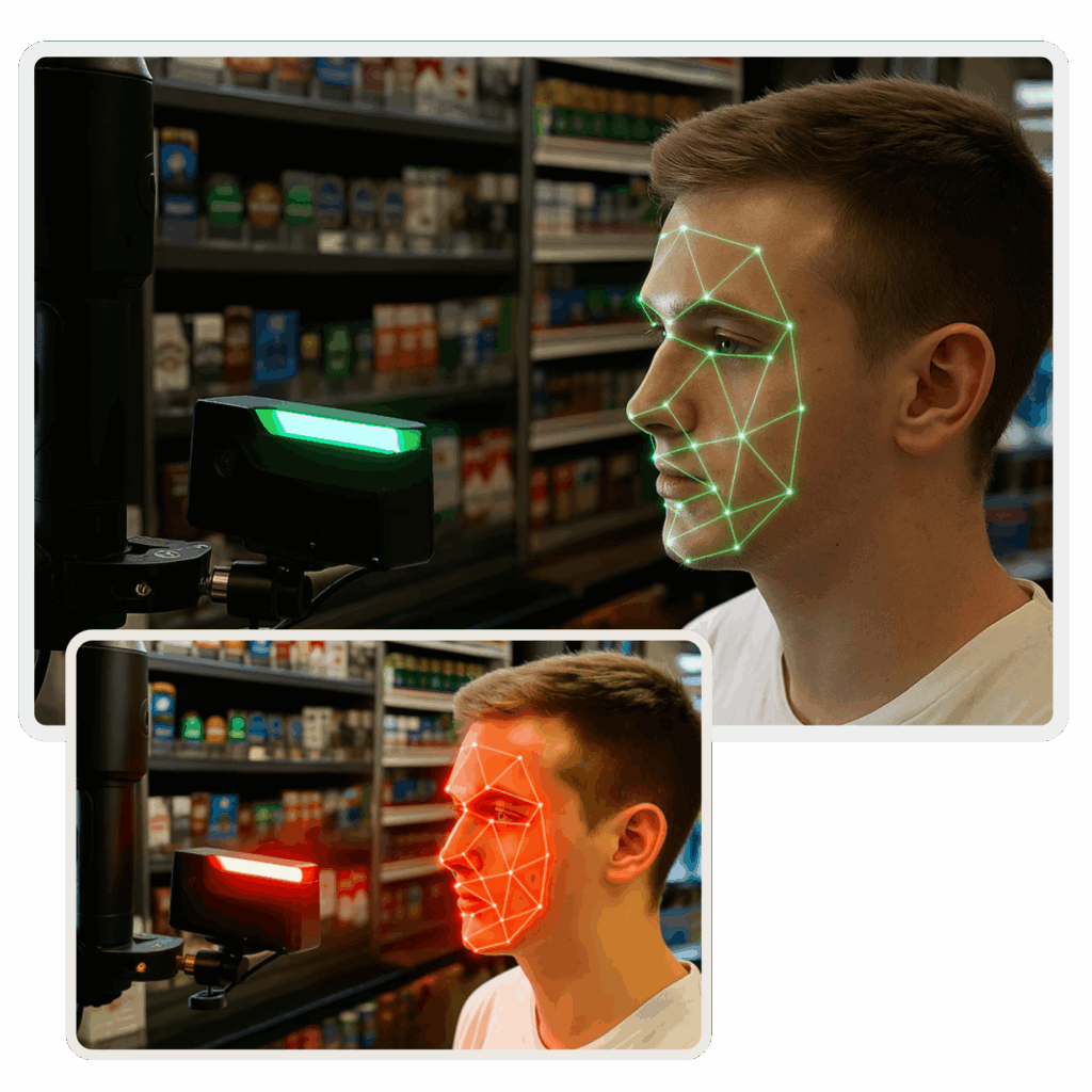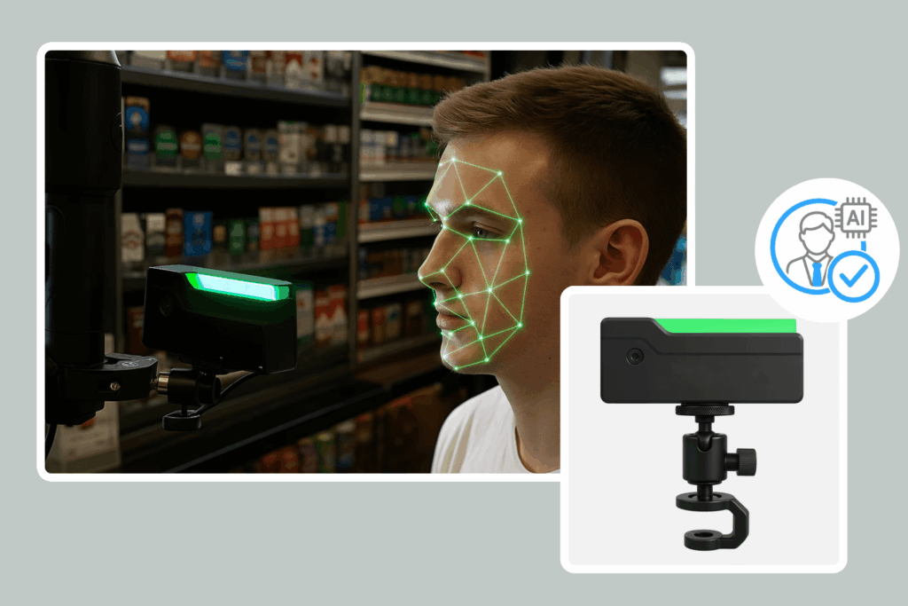 Kompakt, önálló AI-alapú életkorbecslő eszköz. Nincs várakozási idő, zökkenőmentes vásárló ellenőrzés.